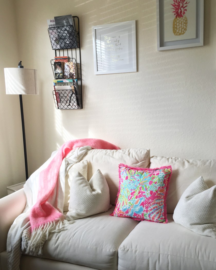 Many of my friends and family know that I am a HUGE fan of Lilly Pulitzer, I just can’t get enough! I am in the process of redoing our office. At the moment, I have only tackled the main wall that faces the entry. I still have so much work to do like hanging up more tropical photography and I am think while writing this post that I might switch out the black magazine rack for a gold one. I think it will blend in more with the theme that I am aiming for. It is just way to bold and I am trying to steer away from anything dark. The lamp will do for now, but it is definitely another piece that I would like to replace.